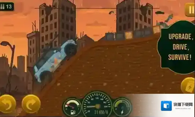 游戏中的玩法是很经典的冲刺闯关,你将驾驶各种车辆来一路冲刺抵达安全屋,通过获得更多金币来升级不同的设施,解锁更多的车辆让你可以跑的更远,完成各种各样的挑战任务来获得丰富的奖励,不断击败更多的僵尸来保护自己的车辆,不断冲刺在这个末日世界里生存下去。