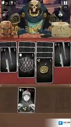 2、进入关卡后玩家会随机获得不同的卡牌,其中长剑是攻击,盾牌是格挡,药瓶是恢复,卡牌右上角的数字代表了可以造成的伤害或者可以恢复的血量。