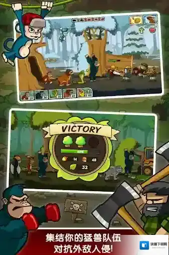 游戏中玩家们将会化身为一只灵活穿梭在森林中的猴子,带领自己的动物小伙伴们去抵御伐木工的进攻,将这些破坏生态环境的人类全部驱逐出森林!并且随着关卡的推进,可以去解锁更多不同类型的动物,利用好它们独特的能力可以助你闯过更多关卡。