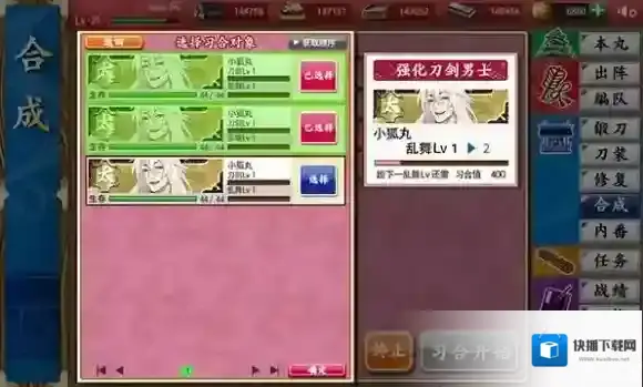 通过「习合」使用相同的刀剑男士来提升「乱舞」等级。