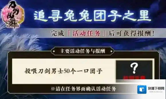 审神者在出阵时偶尔会发现兔子的踪迹,通过击败敌人、追寻兔兔或击破BOSS,有几率获得活动道具一口团子。对刀剑男士使用一口团子,能够大幅恢复一位刀剑男士的疲劳度,并听到全新的特别语音;完成活动任务对刀剑男士使用50个一口团子后,可以获得中秋特别景趣。
