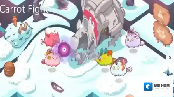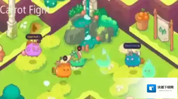 1、在Carrot-Fight首场景,点击箭头指向的紫色角色,触发互动(战斗/任务),推进游戏。