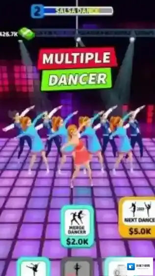 3、“MULTIPLEDANCER”提示,还有“MergeDancer”“NextDance”功能按钮,呈现舞者表演萨尔萨舞的场景,玩家可通过合并舞者、解锁新舞蹈来经营舞蹈团队。