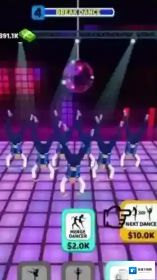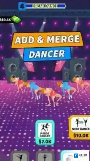 1、有“ADD&MERGEDANCER(添加并合并舞者)”玩法提示,以及“NEWDANCER”“NEXTDANCE”等功能按钮,玩家可通过添加、合并舞者来经营舞蹈团队,开展舞蹈表演。