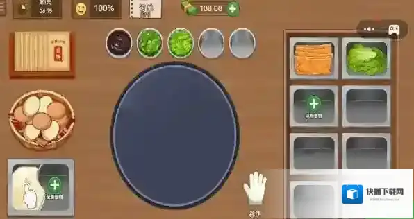 3、进入煎饼制作界面,点击左侧食材,按步骤添加至煎锅,搭配右侧生菜等食材,完成经典煎饼制作,交付订单。