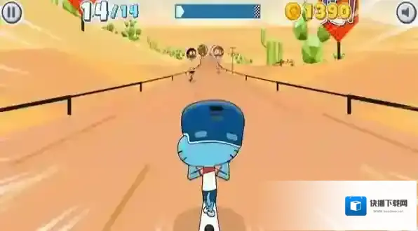2、赛道跑酷操控戴蓝头盔的角色,在公路赛道滑行,躲避障碍,收集金币(000→015),完成“14/14”关卡目标。