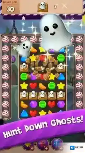 2、双模式关卡矩阵:常规关卡设置“糖果收集”“障碍破除”等目标,特殊关卡开启“幽灵搜寻”模式,需在消除中识破伪装糖果下的幽灵,误触则触发藤蔓缠绕等随机障碍。