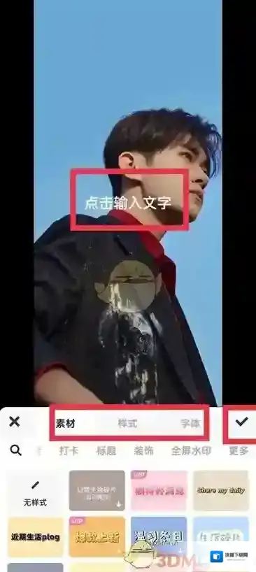 7、然后输入文字调整好大小,位置,样式,素材之后点击对号图标即可。