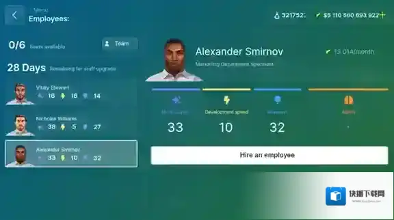 3、不同的员工等你去招募,每位员工都有不同的属性等你去选择。