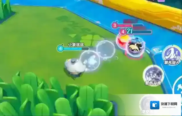 流浪小象哆哆施展一技能“浮空泡泡”,流浪小象哆哆使用泡泡枪射出多个泡泡,对命中的敌人造成3秒「浮空」;当处于「浮空」状态下的敌人受到攻击,泡泡将破裂并额外造成一段伤害。