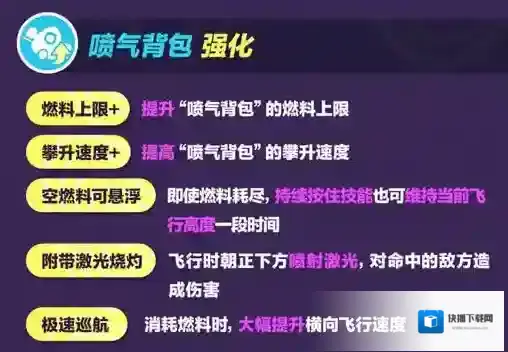 “墨汁炸弹”强化方向追击蛋全新技能“喷气背包”:使用时会消耗能量进行飞行,落地后将持续恢复能量。借助“喷气背包”,追击蛋便可以高效翻越地形,或灵活躲避弓箭、地雷等低空控制道具。