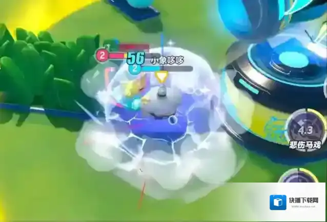 一技能“浮空泡泡”施展二技能“悲伤马戏”,流浪小象哆哆轻轻跳起随后坐向地面,对范围内的敌人造成伤害。
