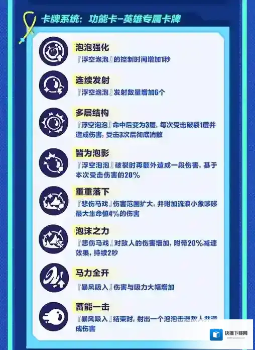 终极技能“暴风吸入”超燃蛋仔“流浪小象哆哆”同样有着别具特色的专属卡牌。在实战中,蛋仔们可以通过卡牌选择搭配出不同的战斗流派。如选择“重重落下”“泡沫之力”提升“悲伤马戏”的伤害,即可在控制技能后衔接巨额伤害完成收割;又或者选择“多层结构”“泡泡强化”“皆为泡影”,强化“浮空泡泡”的控制与伤害能力,辅助队友打出意想不到的控制爆发!