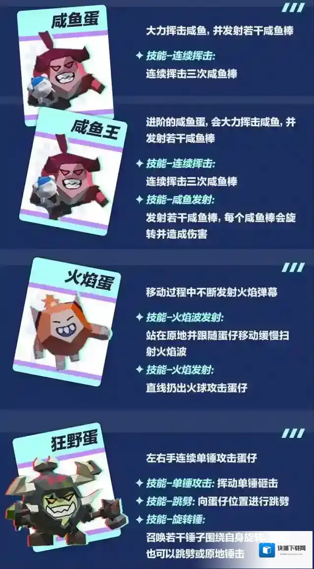 全新超级血清此次更新同样迎来了机制上的迭代升级。超级血清将可以进行单独的刷新,而技能刷新机制选代为累计次数,并有相应的被动与血清配合,从而方便特种蛋构筑更加缜密完备的策略体系。同时,灼烧、中毒、麻痹、虚弱等异常状态机制也迎来了迭代,使异常状态的相关流派得以加强。更多调整详情,欢迎蛋仔们前往战场亲身体验!战况升级!四大BOSS威胁降临特种蛋的实力不断精进,然而面临的挑战也更加严峻,4大BOSS降临战场带来致命威胁。挥击并抛出咸鱼棒的“咸鱼蛋”“咸鱼王”,不断发射火焰弹幕和火球的“火焰蛋”,手持单锤暴力跳劈的“狂野蛋”,都将加入战斗在BOSS节点随机出现。速速奔赴战场迎接全新挑战,击败变异蛋捍卫蛋仔岛吧!