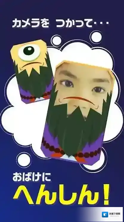 1、在拍照界面,按照“カメラを-つかって(使用相机)”的提示,使用相机拍摄面部,生成带有达摩形象的效果,然后点击箭头指向位置继续。