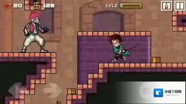 2、左上角显示红心数量为20,货币数量为128,等级标识为“LVL2”,画面中有两个角色,一名持剑的角色准备攻击上方平台的敌人。