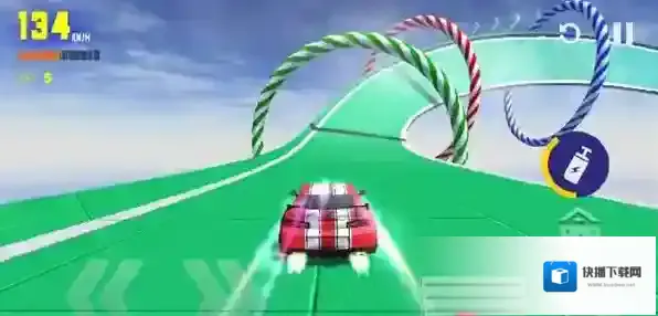1、驾驶赛车冲绿色螺旋赛道,留意右侧技能图标,遇弯道、坡道合理用加速,保持高速过障碍。