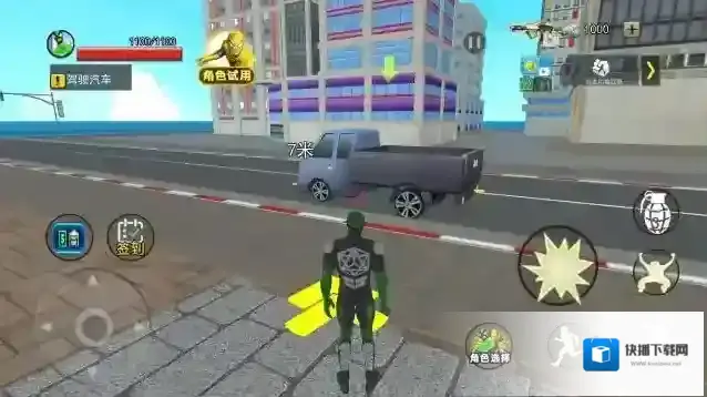 2、驾驶紫色汽车,按箭头指引前往指定地点,注意避让,准时送达货物。