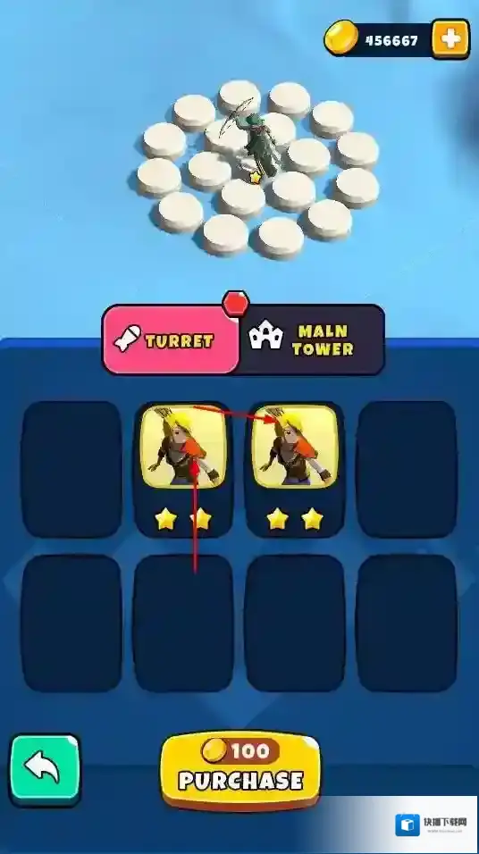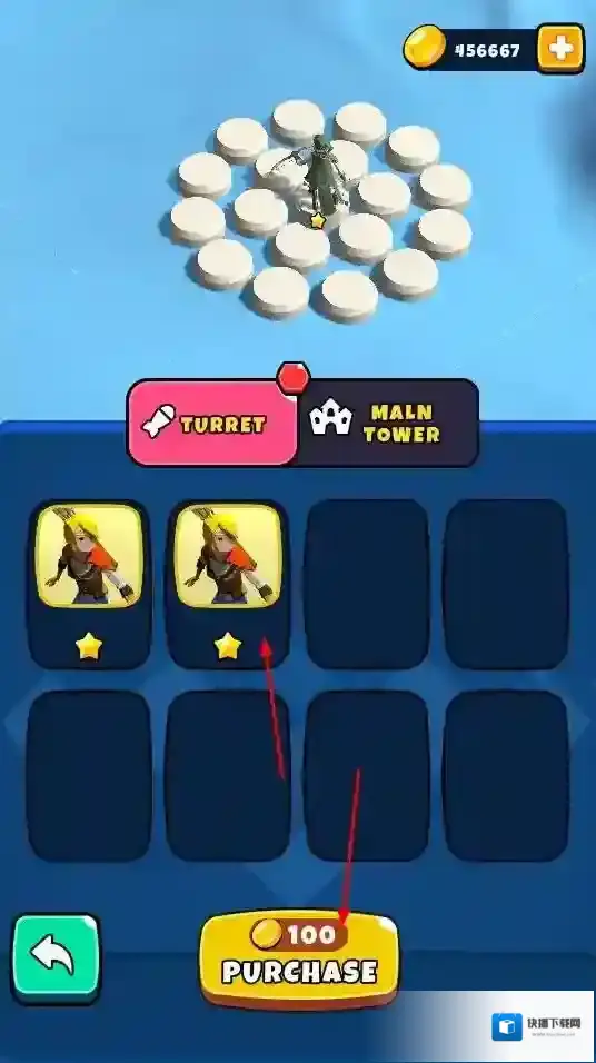 1、“购买士兵”,消耗金币(100),在“TURRET”栏购买士兵卡牌,填充防御阵容。