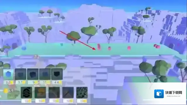 2、“布置建筑”,选择建筑类型(如蓝色、粉色建筑 ),放置在方块地形,覆盖敌人路径。