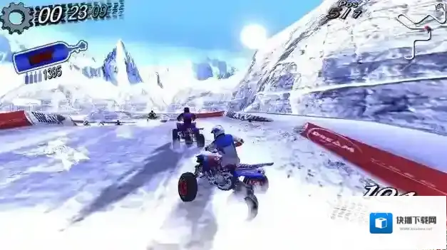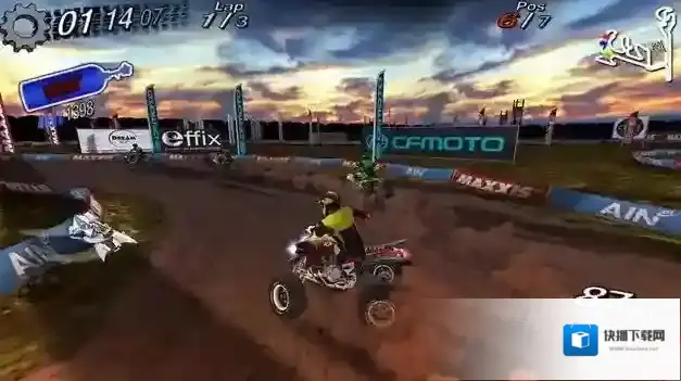2、在“CAREER”模式,驾驶蓝白ATV,沿越野赛道,避障碍、超对手,积累比赛经验。