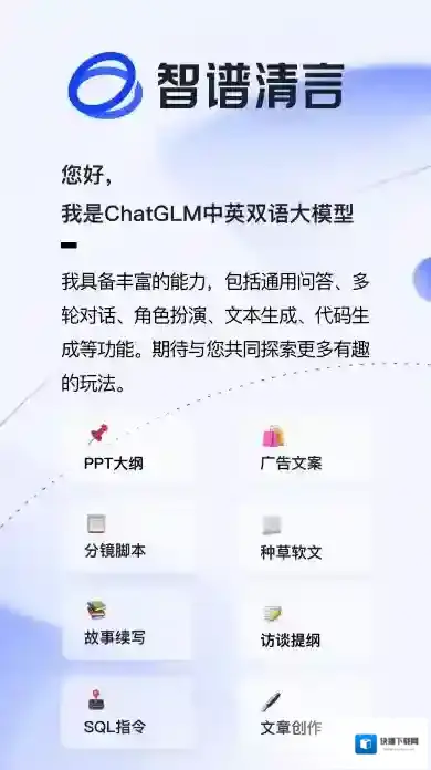 智谱清言是一个能帮你进行语音对话智能生成话语的软件,基于中英双语大模型chatglm开发,帮你“聪明一点”,每天少工作一小时。具备当前很多的丰富能力。