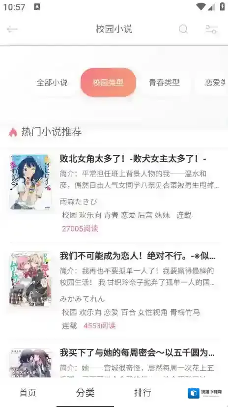 3、分类页面将小说进行了详细的归类,青春、恋爱以及校园等类型都有。