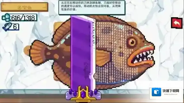 3、拟真鱼类处理系统,钓获的鱼类需要进行刮鳞,去内脏等专业处理,游戏详细展示了不同鱼类的处理技巧。
