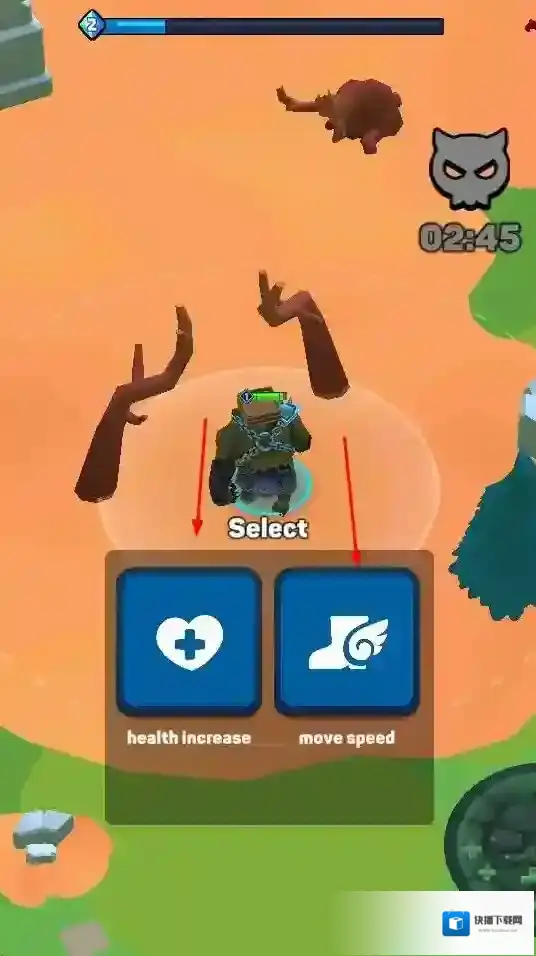 2、“战斗技能选择”,战斗中弹出技能选项,选择提升生命或移速,增强战斗能力。
