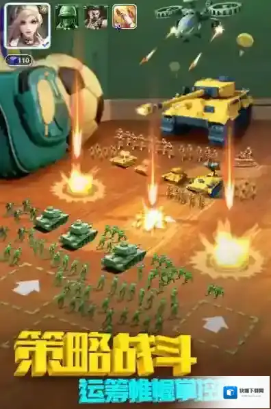 2、战斗界面,利用策略指挥部队(如士兵、坦克),按箭头方向推进,掌控战局,获取胜利。