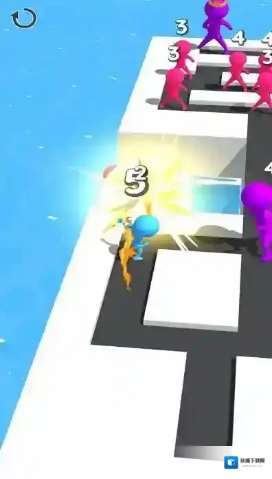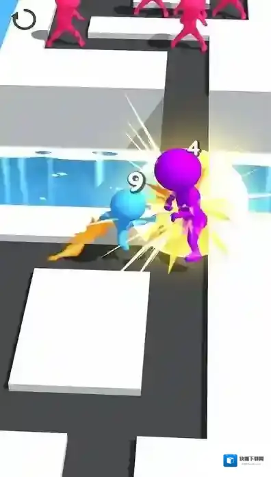 1、画面中有不同颜色的小人(蓝色、粉色、紫色),部分区域标有数字(1、2、4),红色箭头指示操作方向。