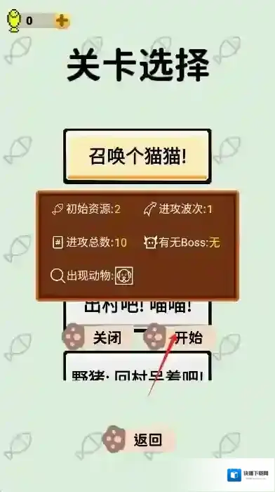 1、猫咪部署:在关卡开始前,可从猫咪图鉴中选择本次关卡可用的猫咪,通过收集金币,在地图指定位置部署猫咪进行防御。