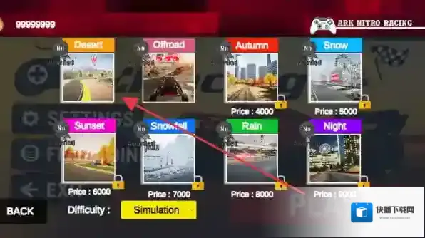 1、多环境赛道设计:包含荒漠峡谷、未来都市、雪山冰原等10种风格迥异的赛道,每条赛道设置不同的地形障碍与氮气加速带,要求玩家根据环境调整驾驶策略。