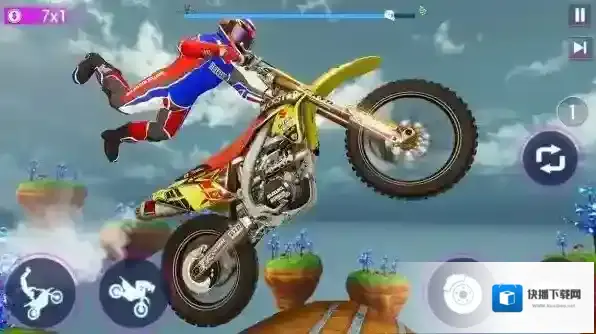 3、在不同关卡(3×2、5×1、7×1等),适应场景变化(场地、空中岛屿),精准控车,完成高难度特技与竞速。