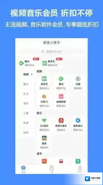 1、推荐爱奇艺、腾讯、优酷、芒果TV、哔哩哔哩客户端、qq音乐、网易云音乐、酷狗音乐等折扣会员信息。