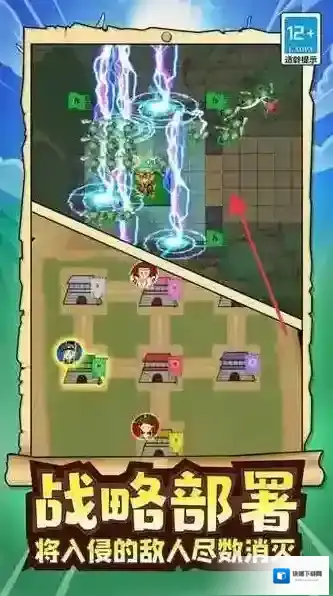 3、“战略部署”,在地图中合理安排防御塔位置,释放技能特效(雷电),消灭入侵敌人。