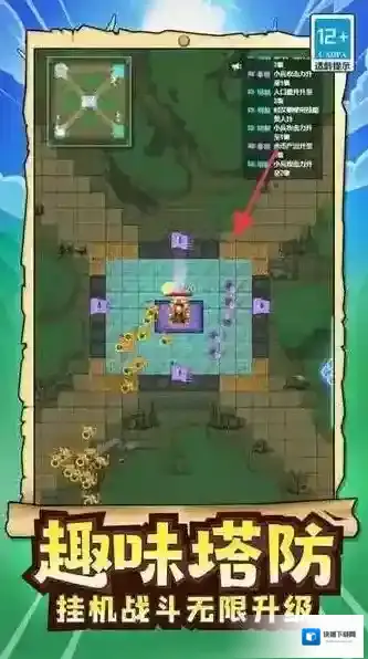 2、“挂机战斗”,布置角色、防御塔后,开启挂机,自动战斗,积累金币,升级防御设施。