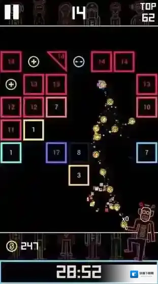 3、冲排名续存挑战:目标是进入前十名,需持续打破砖块并保持生存,通过不断挑战提升成绩,借助物理引擎带来的真实反弹效果,在突破关卡中向更高排名迈进。