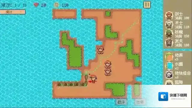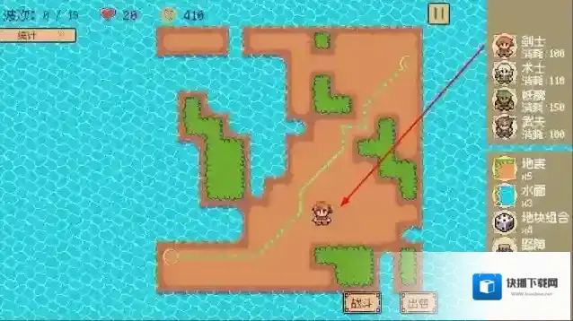 1、“兵种部署”,消耗金币,在岛屿路径布置剑士、术士等兵种,构建防御线。