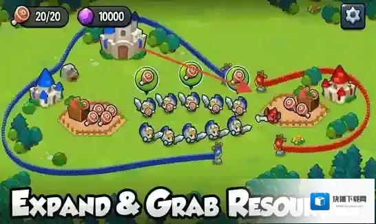 1、“资源抢占”,指挥部队沿路径扩张,占领资源点(食物堆),积累资源(宝石、食物)。