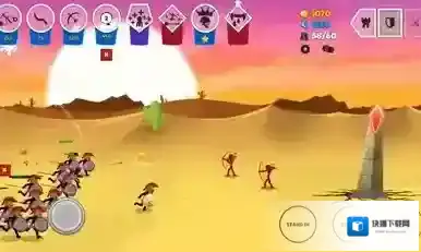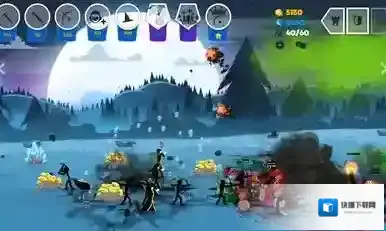 2、本关只要坚持四分半就可以结束,开局先一直召唤矿工和剑士,然后优先让矿工采集金块,当对面来进攻时就全体回撤,让城堡弓箭手来解决对手。