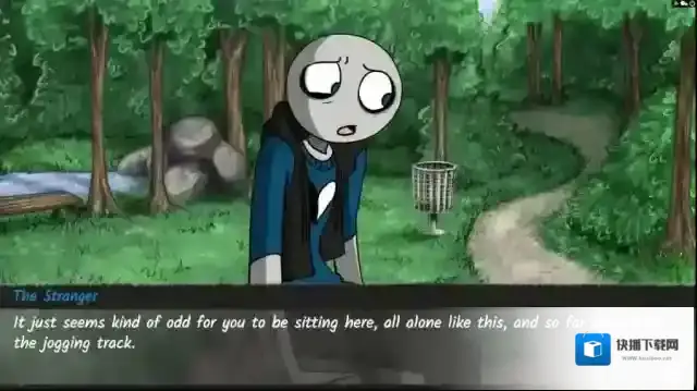 3、呈现了特定场景及对话文本他坐在板凳上盯着我,但我看不懂他的表情,属于剧情推进中的一个情节片段,用于营造故事氛围、推动互动解谜等流程。