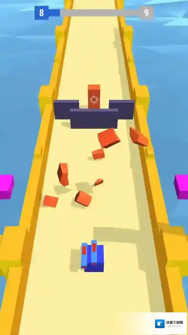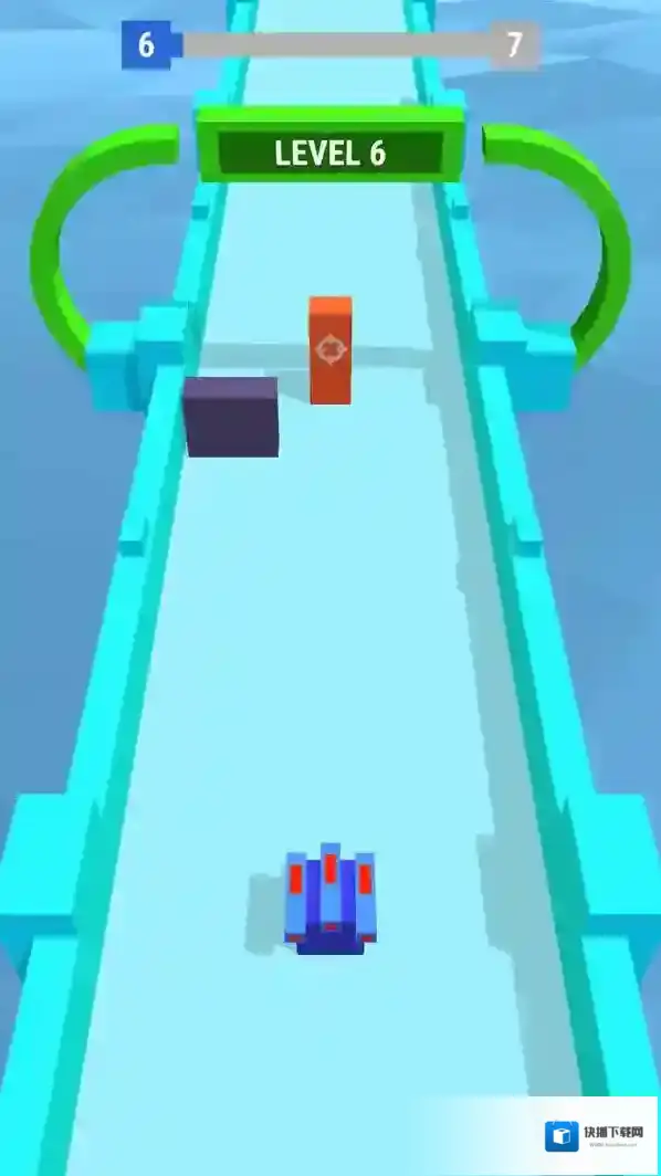2、推进到Level6,观察红色箭头指引,调整小车位置,射击路径上的橙色目标,避开紫色方块。