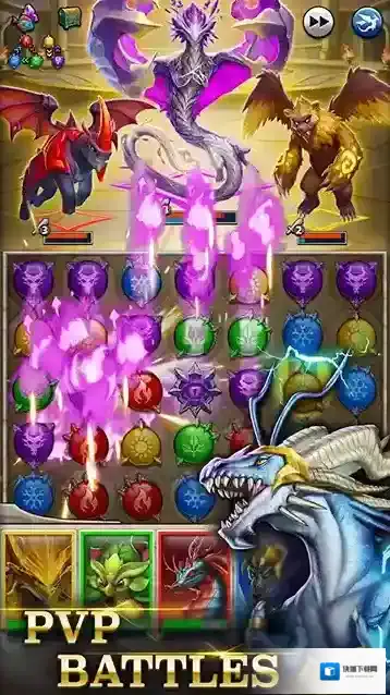 1、战斗阶段通过三消匹配相同颜色的方块,为对应英雄储能并触发攻击或辅助技能。每一轮消除都需预判后续走势,为即将到来的连击做准备。