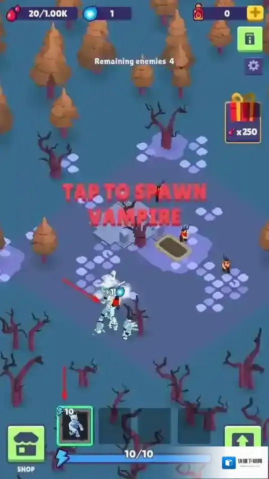 1、点击“TAP TO SPAWN VAMPIRE”,消耗资源召唤吸血鬼单位,投入战场对抗敌人,是基础战斗操作。