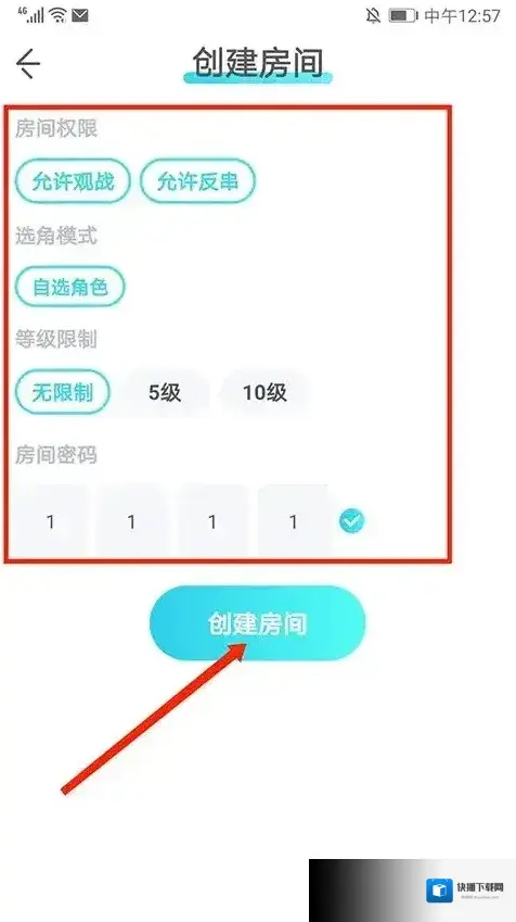 2、进入创建房间界面后,设置房间权限、选角模式、等级限制以及房间密码。