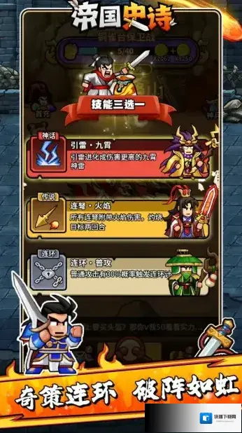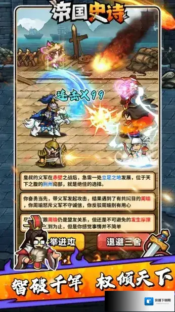 帝国史诗,以三国背景为题材的文字冒险类肉鸽RPG手游。我们将会来到热血的三国时代,在这里开启你的霸业之旅!无需什么复杂的操作,轻松点击推剧情,过五关斩六将,享受畅快杀敌的爽快玩法!在闯关过程中可以自由的去搭配自己的技能组合,每一局的选择都可能不相同,策略性十足,更多丰富多样的玩法模式任你选择,让你畅享酣畅淋漓的战斗盛宴!
