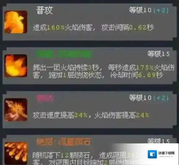 被动技能优先升级以提升火焰伤害,普攻保持适中以节省资源。