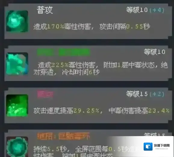 技能提升中毒层数,被动技能优先升级以提升中毒伤害。