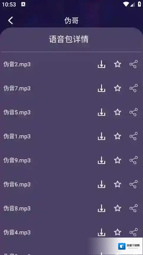 3、点开需要的语音包,可以将语音包进行下载、收藏以及分享。